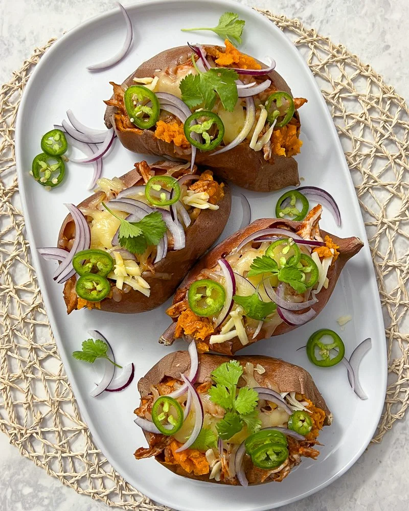 That said, this particular combination is one of our favorites. Toppings include barbecue sauce-laced chicken and lots of melty cheese, plus red onion, jalapeño, and cilantro. Give it a try, then try your own combinations. You can’t go wrong with topped sweetpotatoes. They’re easy, tasty, healthy, and endlessly adaptable!